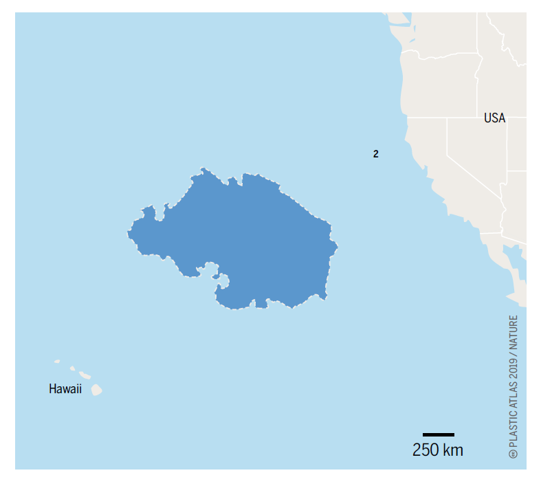 Cada año, unas 10 millones de toneladas de residuos plásticos terminan en los océanos, lo que equivale a una camionada por minuto. Los plásticos que terminan en el mar tienden a concentrarse en cinco enormes islas ubicadas en el Pacífico norte y sur, en el Atlántico norte y sur y en el océano Índico. La más famosa es la gran mancha de basura del Pacífico, en el Pacífico norte. Según algunos cálculos, esta isla flotante está formada por 1,8 billones de residuos, de los que el 99,9 % son residuos plásticos; además de trozos de redes de pesca, botellas, tapas, contenedores, juguetes, etc. En el mapa de la izquierda se puede apreciar la superficie que ocupa esta gran mancha de basura.
